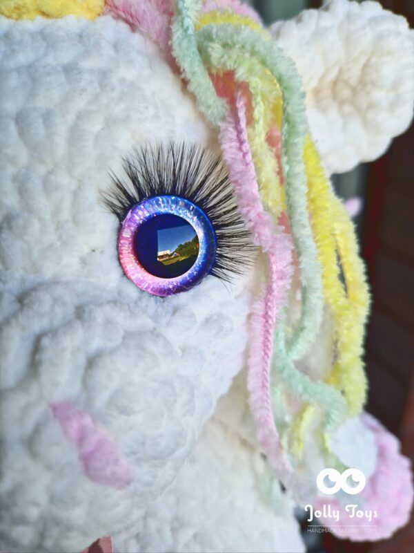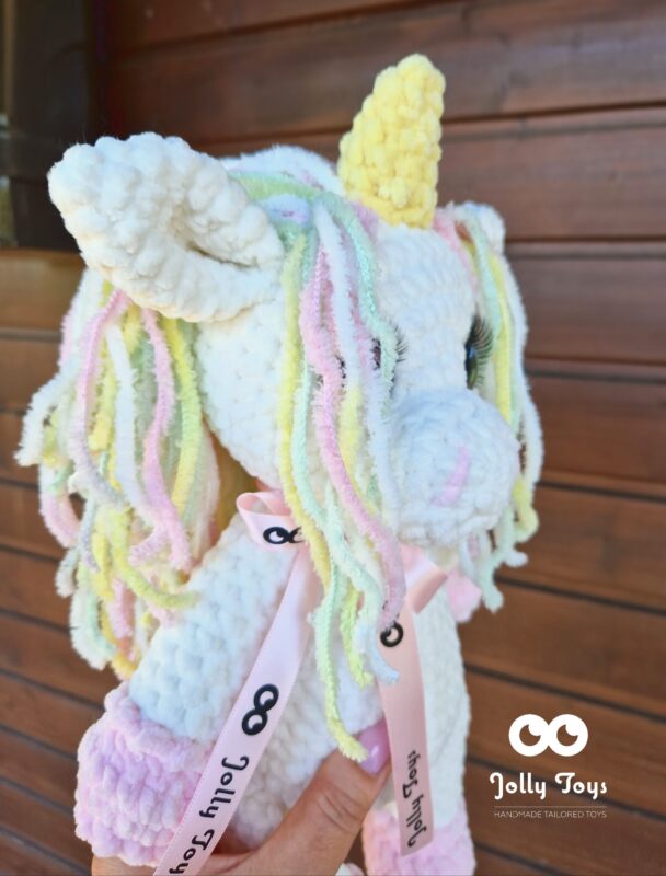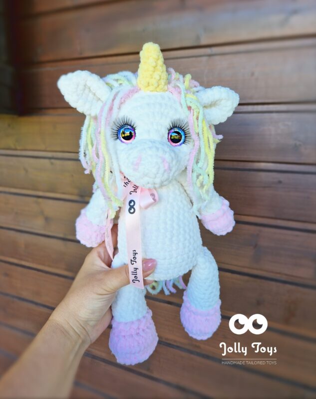 In front of you is the dream of every little girl – a magical unicorn. The unicorn is very soft. The toy is crocheted from high-quality hypoallergenic yarn, which is very soft. Glowing eyes are completely safe, so don’t worry about your child biting or dragging them out. Those bright eyes will not leave anyone indifferent! Color: milky white, pink. Length 35 cm.