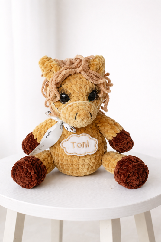 Are you looking for the perfect, slightly smaller, and personalized cuddly friend for your child? This hand-crocheted light brown horse is designed to offer soft and secure warmth, while also being a meaningful keepsake.