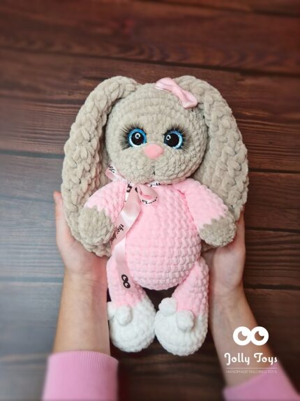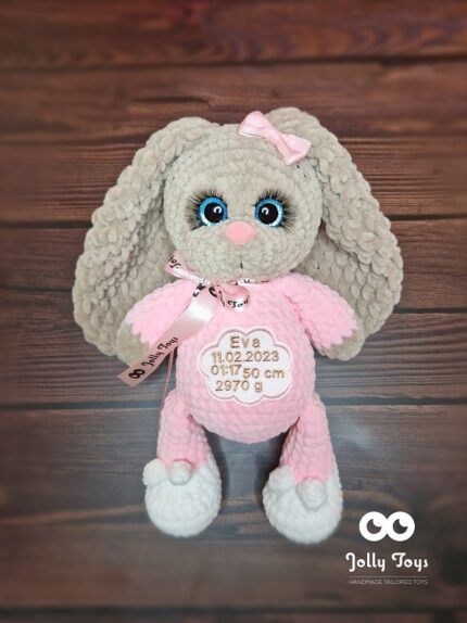 The teddy bear is crocheted from hypoallergenic plush yarn suitable for children, the length is about 35 cm. The eyes are securely attached. Color: brown and pink. The data is added to the body.