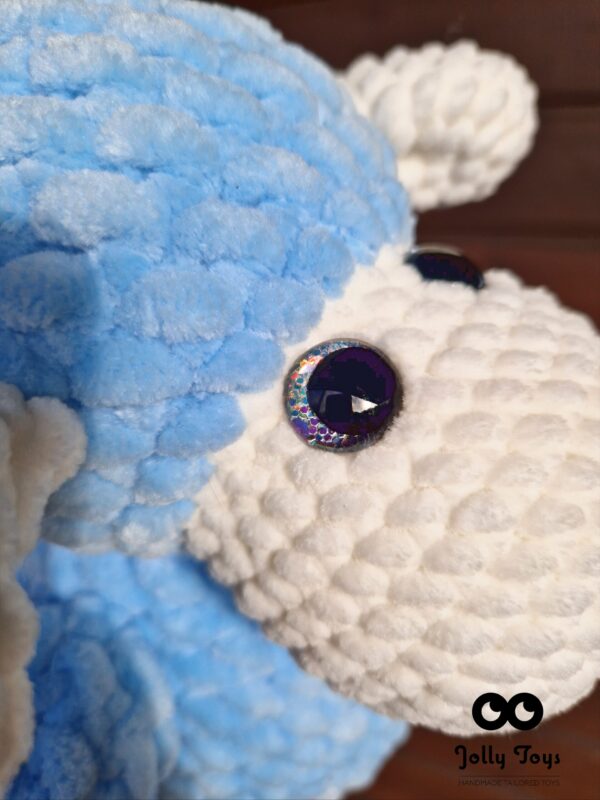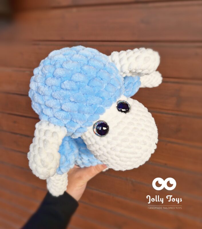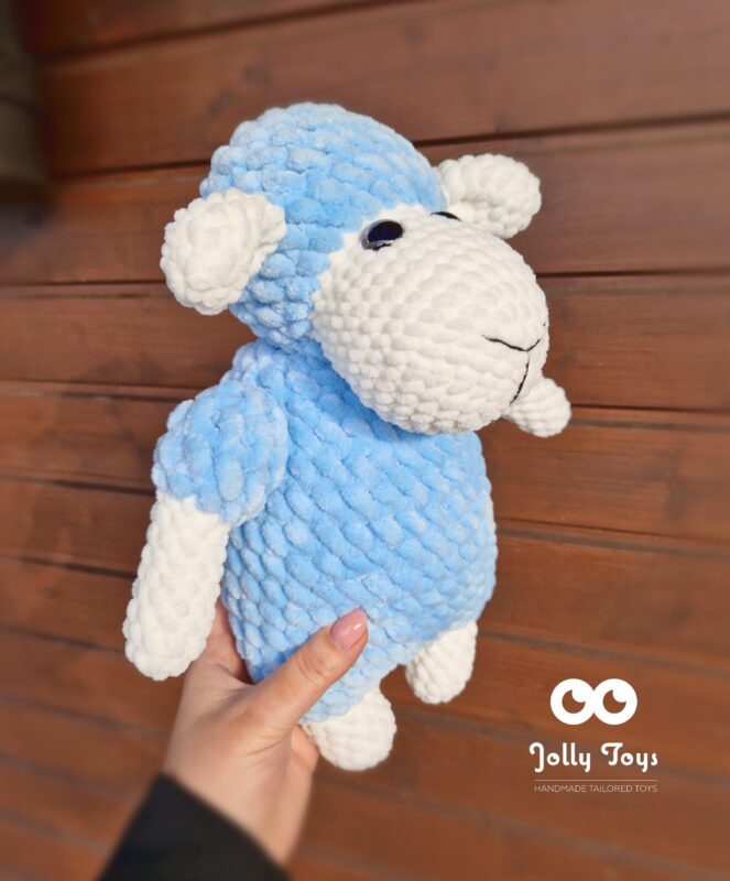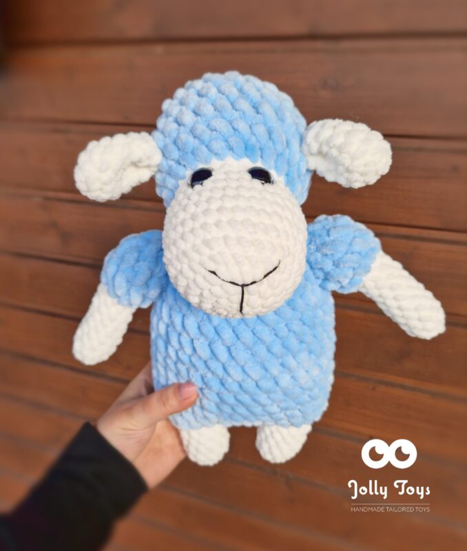 The sheep is crocheted from high-quality hypoallergenic yarn, which is very soft. Bright eyes are firmly attached. Those bright eyes will not leave anyone indifferent! Length 35 cm. Color: light blue and milky white. The name and date of birth are added to the stomach.