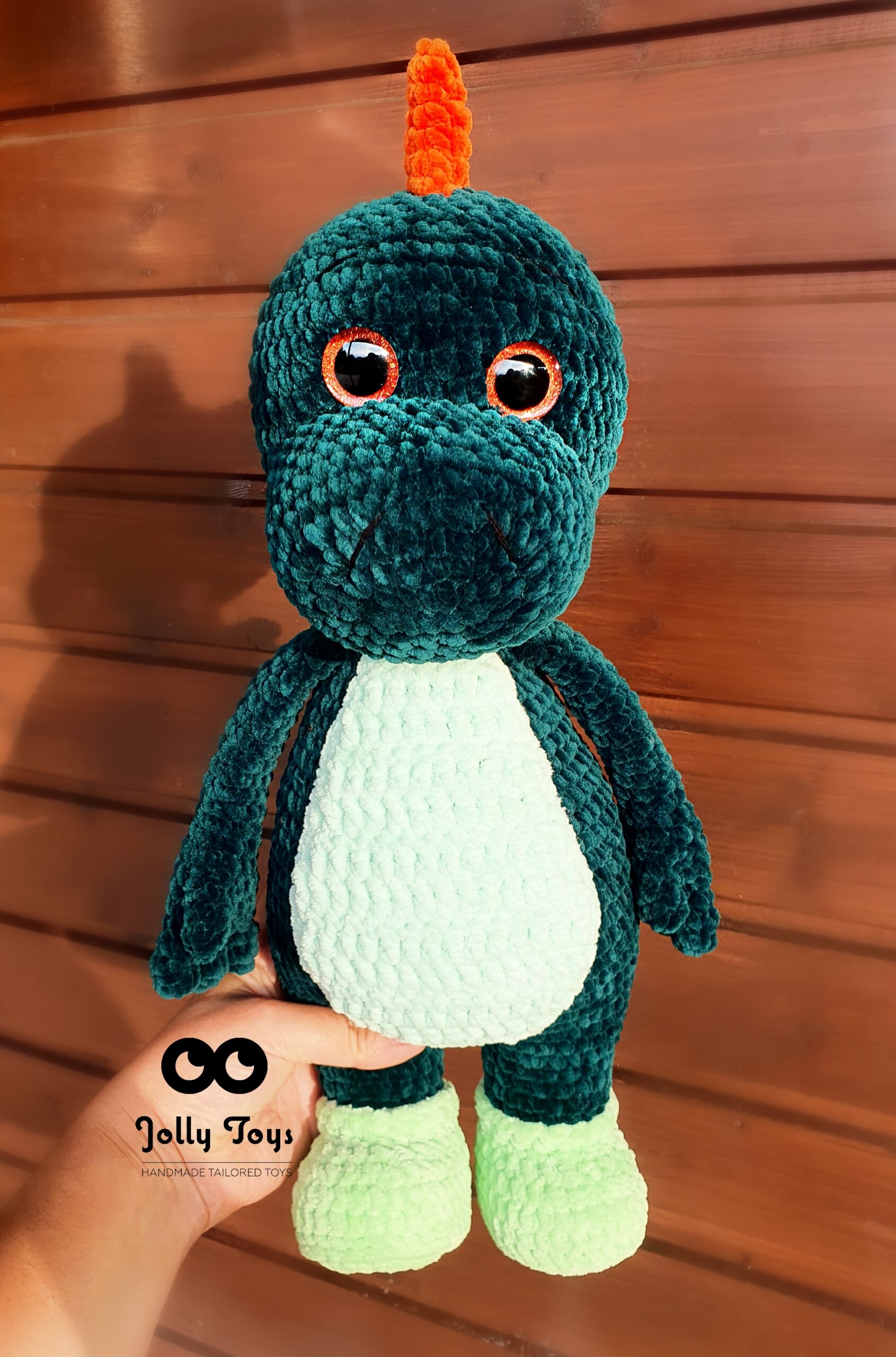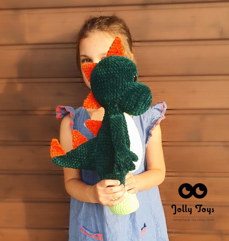 The bright-eyed dinosaur is crocheted from high-quality hypoallergenic shenille yarn, which is very soft. Large, bright eyes are completely safe, so don’t worry about your child biting or pulling them out. Crochet for your child with love and warmth. The dino is about 45-50 cm long.