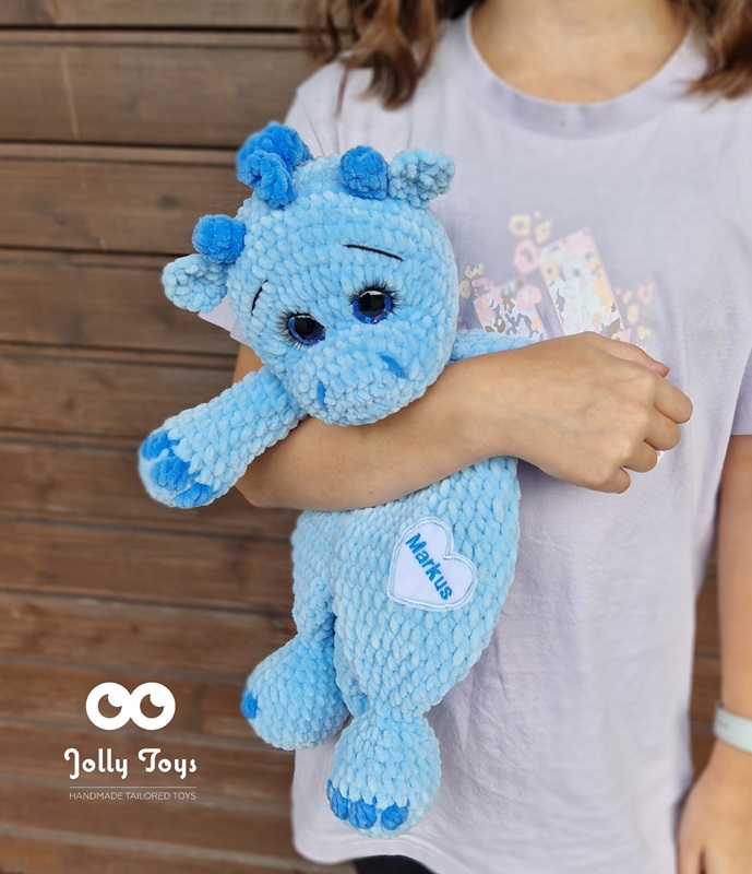 The toy is crocheted from hypoallergenic plush yarn suitable for children, the length is about 40 cm. The eyes are securely attached. Color: blue. Admed is added to the body.