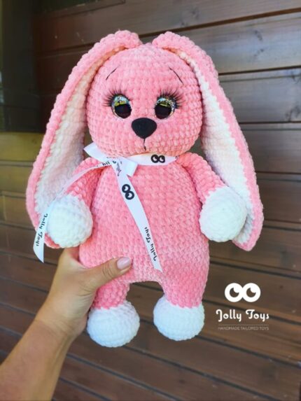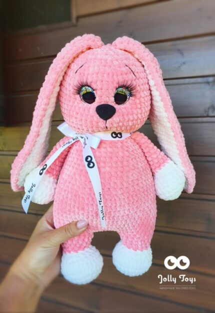 The bunny is crocheted from a hypoallergenic plush yarn suitable for children, which is pleasantly soft. Length with ears 40cm. Shiny eyes and a nose are completely safe, so don’t worry about your child biting or pulling them out. These sparkle eyes will not leave anyone indifferent! All you have to do is touch the product and you don’t want to miss it anymore. Colors: brown and pink.