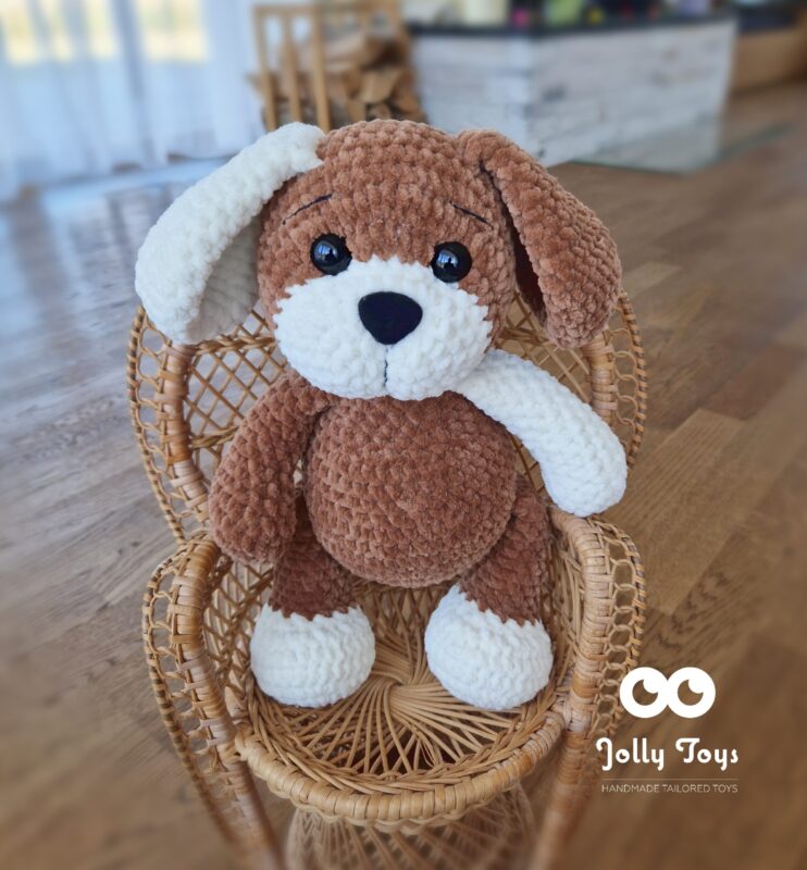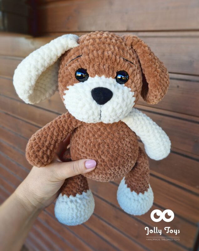 In front of you is a charming plush brown dog! Crocheted from hypoallergenic plush yarn (chenille) suitable for children, which is very soft. Length 32 cm. Color: brown and milky white. The eyes and nose are firmly attached. The data is added to the stomach.
