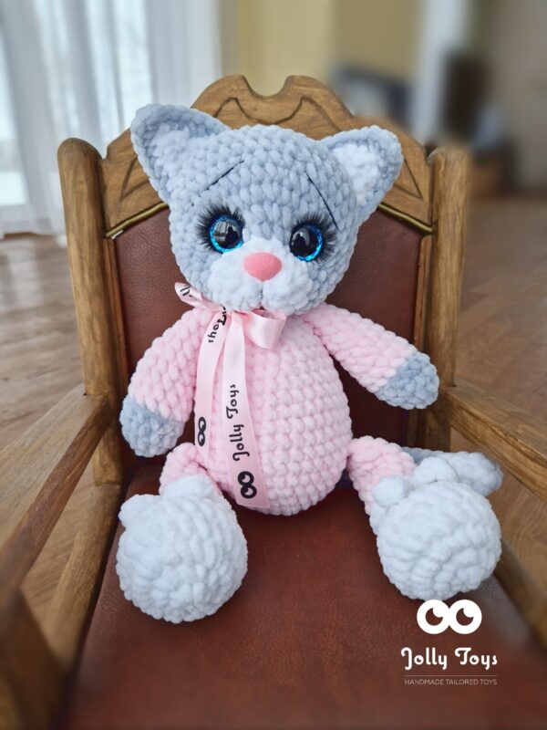 In front of you is the animal of the year 2023 – the Jolly Toys cat. Very cute and soft crocheted toy. The glowing eyes and nose are completely safe, so don’t worry about your child biting or dragging them out. Eyelashes glued. A crocheted cat can stand on a support. Length 30 cm. Color: gray and pink.