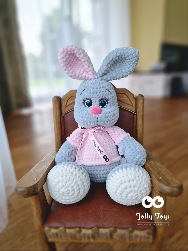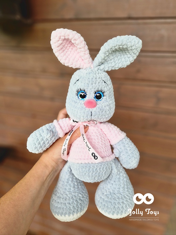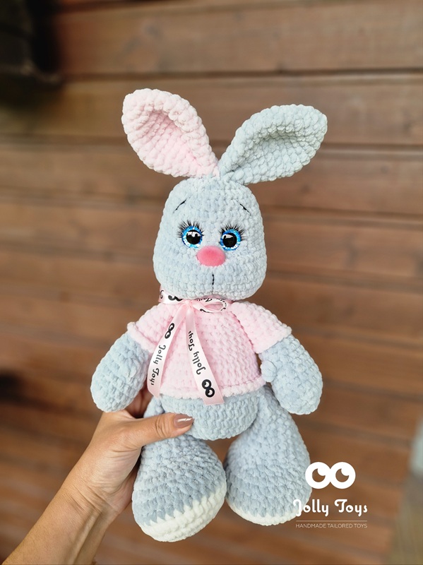 The bunny toy is crocheted from hypoallergenic plush yarn that’s soft and gentle for babies. It measures approximately 40 cm including the ears. The shiny eyes and nose are completely safe, making it suitable even for the most curious little nibblers. These sparkling eyes won’t leave anyone indifferent! Once you touch this toy, you won’t want to let go.