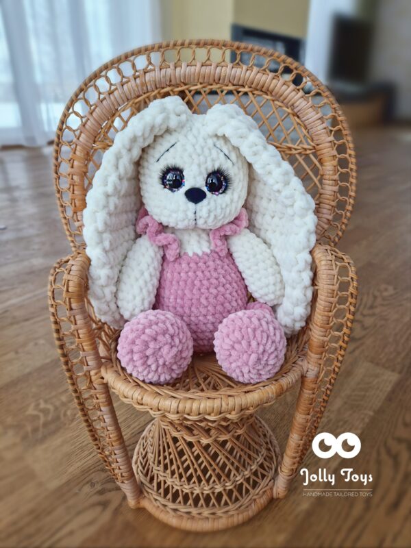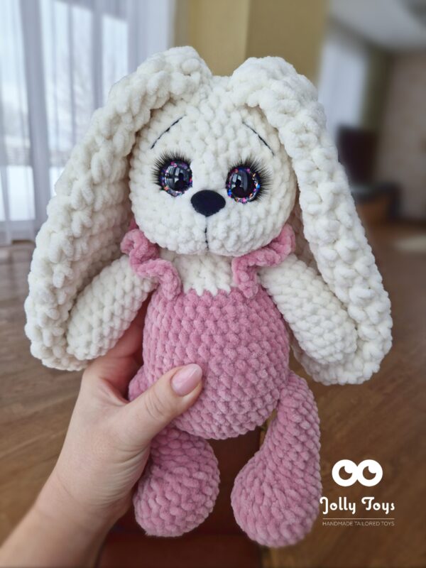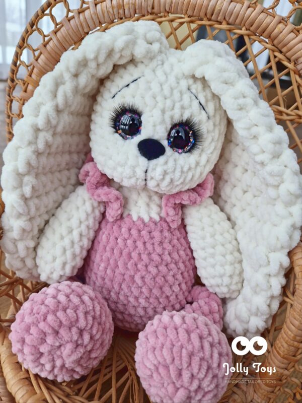 In front of you is a crocheted bright-eyed stylish bunny. Crocheted from high quality hypoallergenic yarn that is very soft. Bright eyes and a nose firmly attached. Those bright eyes will not leave anyone indifferent! Color: milky white and dull pink. Height 33cm.