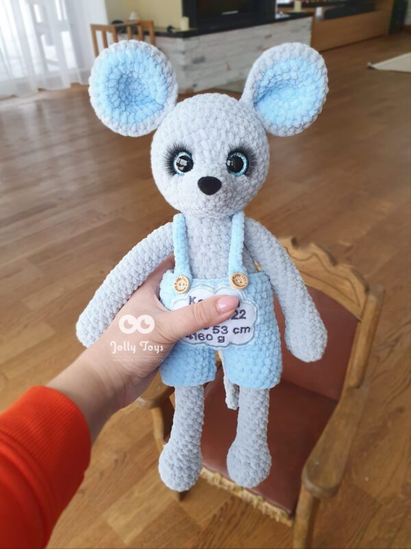 Crocheted children’s hypoallergenic plush yarn, mouse length over 40 cm. Eyes and nose are securely fastened, lashes are glued to it.