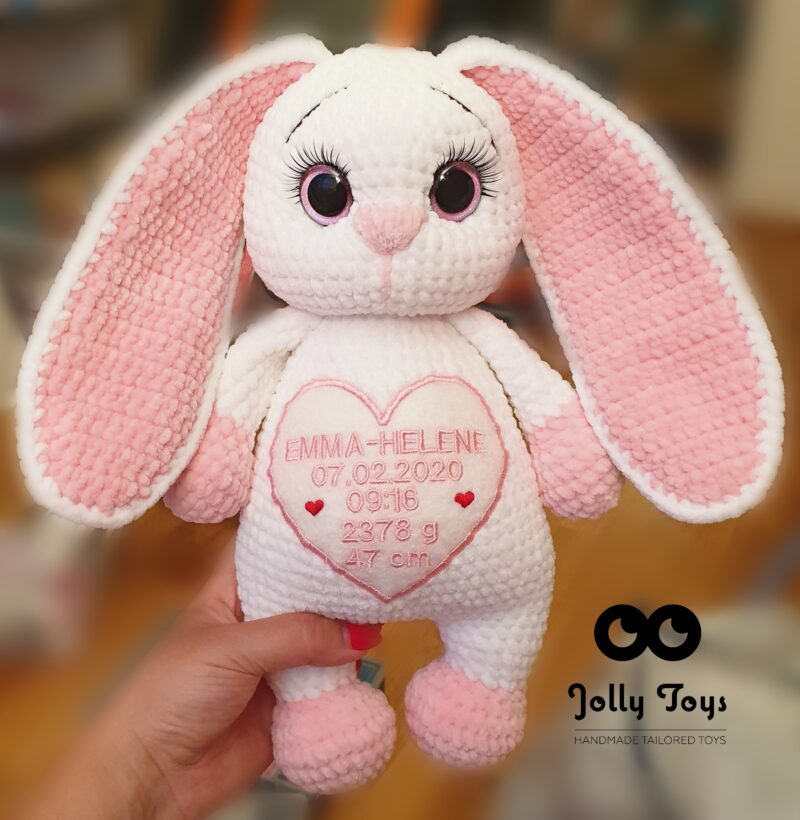 If desired, we can also embroider a name, name and date or all birth data (date, time, weight, height) on the toy. To do this, select “personalization” from the drop-down menu and add the desired text to the “description of personalization” and “Your text” boxes. Please write Name, date, time, weight and height.