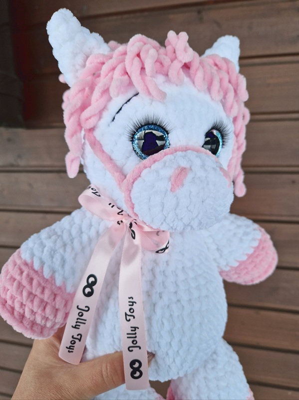 This soft and cuddly horse is 40 cm long and perfect for both playing and hugging. The white and pink color combination gives it a gentle and charming look that immediately warms the heart.