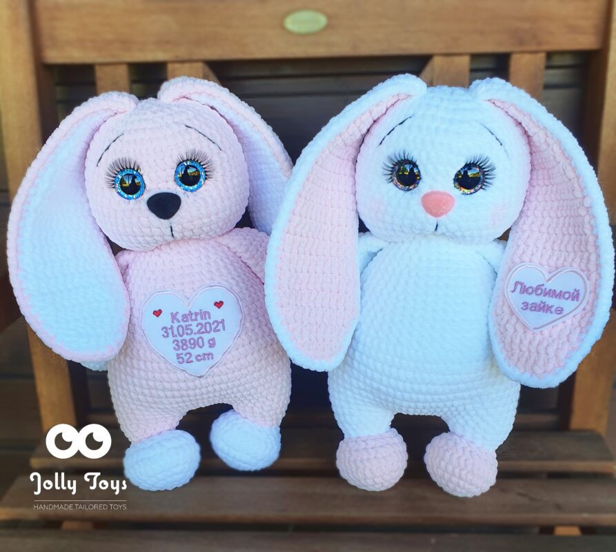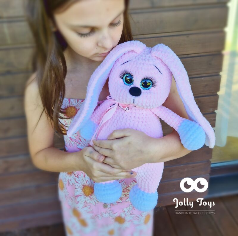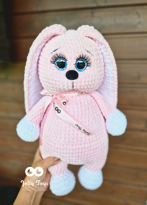 This toy is crocheted from soft, hypoallergenic plush yarn that’s safe for children. The large, cuddly bunny with sparkling eyes measures about 43 cm in length. The eyes and nose are securely attached, and the eyelashes are carefully glued on. Color: pink. The shiny eyes and nose are completely safe, so you don’t have to worry about your little one biting or pulling them off.