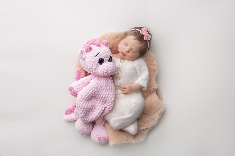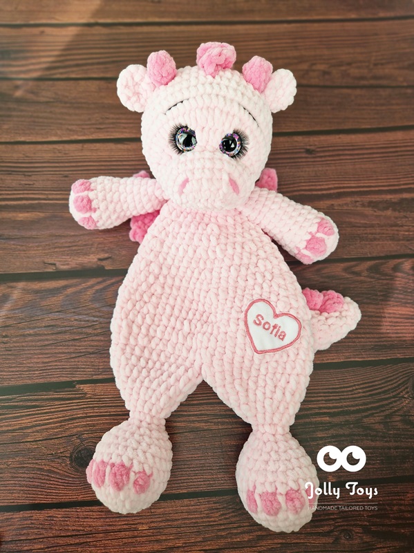 The toy is crocheted from hypoallergenic plush yarn suitable for children, the length is about 40 cm. The eyes are securely attached. Color: pink. Admed is added to the body.
