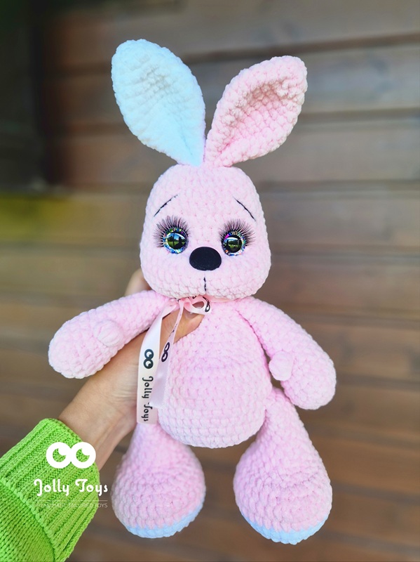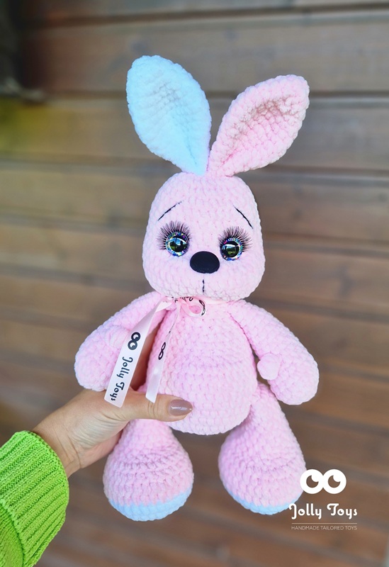 The pink bunny with special ears is crocheted from hypoallergenic plush yarn suitable for children, which is pleasantly soft. Length including ears 40cm. The glowing eyes and nose are completely safe, so don’t worry about your child biting or dragging them out. Those bright eyes will not leave anyone indifferent! All you have to do is touch the product and you won’t want to put it down. Colors: pink and milky white
