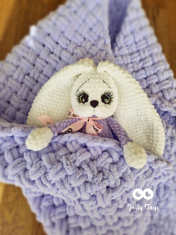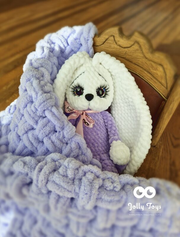 If you are looking for a heartfelt gift for your dear girl, the charming Miss Bunny is a great choice! The handmade toy is crocheted from hypoallergenic plush yarn (chenille) suitable for children, length 32 cm. The eyes and nose are securely attached. Color: white and purple.