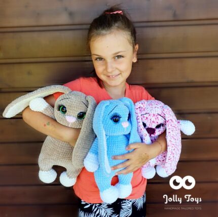Teie ees on võluv jänkupreili. Mänguasi on heegeldatud lastele sobivast hüpoallergilisest plüüslõngast (šenill), pikkus 33 cm. Silmad ja nina on ohutult kinnitatud, nii et ärge muretsege, et laps hammustub või tirib neid välja. Värv: valge ja roosa, kuid soovi korral saame teha ka teist värvi (selleks kirjutage palun sobivad värvid märkustesse). Suurus: 33 cm.