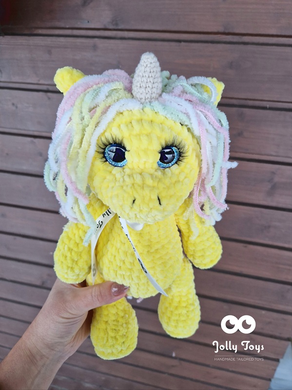 See kollast värvi ükssarvik on pehme ja kaisusõbralik, loodud väikesele lapsele esimeseks muinasjutuliseks sõbraks. Säravad silmad annavad talle elava ja maagilise ilme ning värviline lakk muudab ta eriti rõõmsaks ja pilkupüüdvaks. Ükssarvik on 33 cm pikk ja just paras, et teda kaissu võtta või igale poole kaasa võtta.