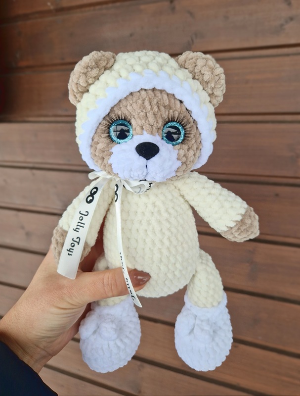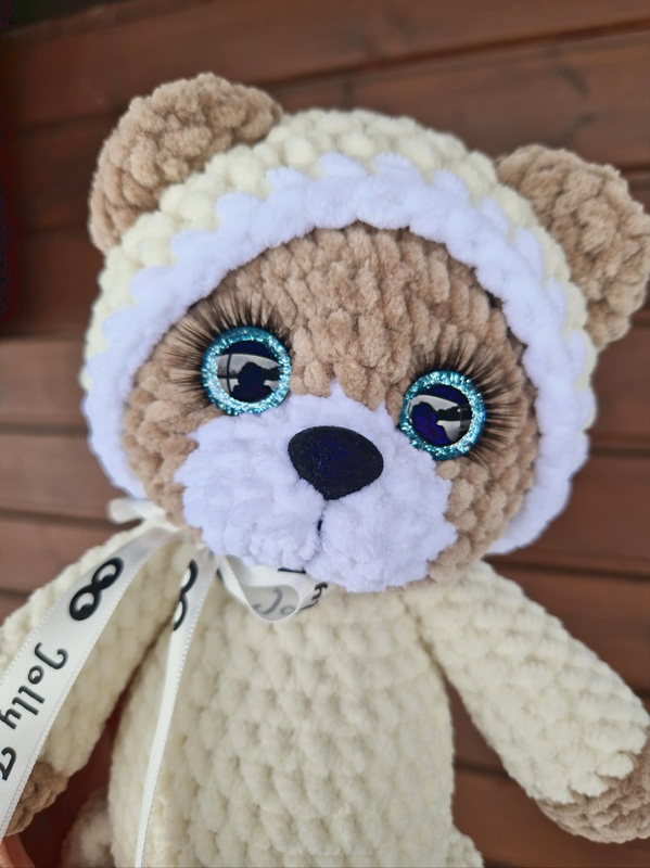 Armas karu-unimüts piimavalget värvi pidzaamas. Heegeldatud kvaliteetsest hüpoallergeenilisest lõngast, mis on väga pehme. Sinised säravad silmad ja nina on kindlalt kinnitatud. Need säravad silmad ei jäta kedagi ükskõikseks! Pikkus 30 cm. Värv: pruun ja piimavalge. Nime ja sünniandmed lisatakse kõhu peale.