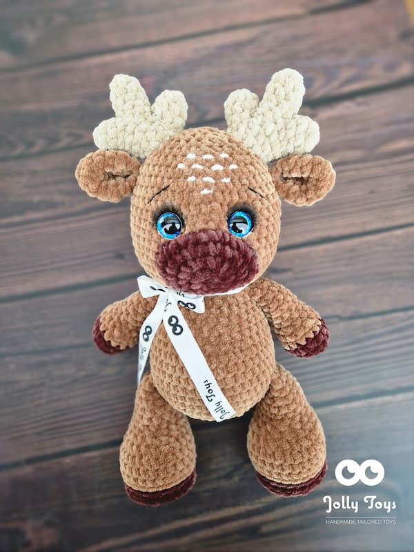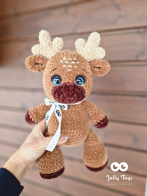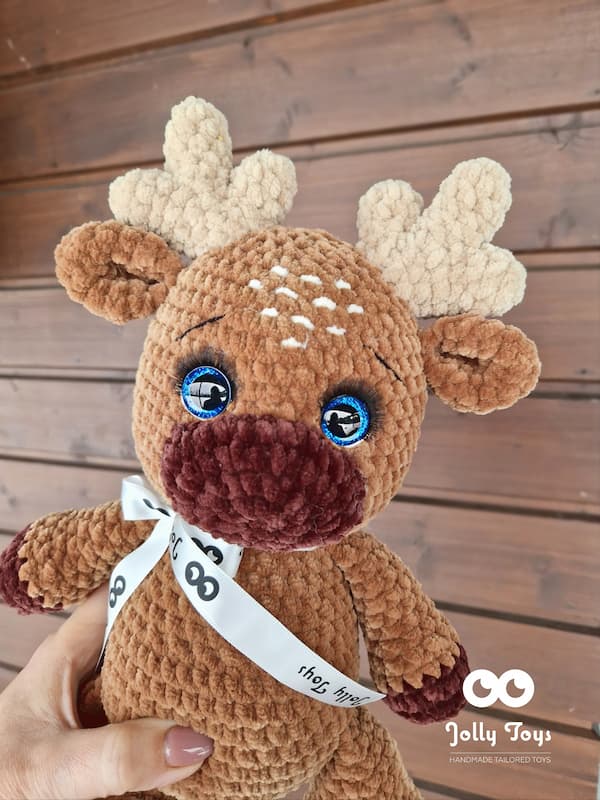 Säravad silmad on täiesti ohutud, nii et ärge muretsege, et laps hammustub või tirib neid välja. Põder on heegeldatud lastele sobivast hüpoallergilisest plüüslõngast, mis on mõnusalt pehme. Põder saab toe najal seista. Pikkus 36 cm. Värv: pruun ja tumepruun.