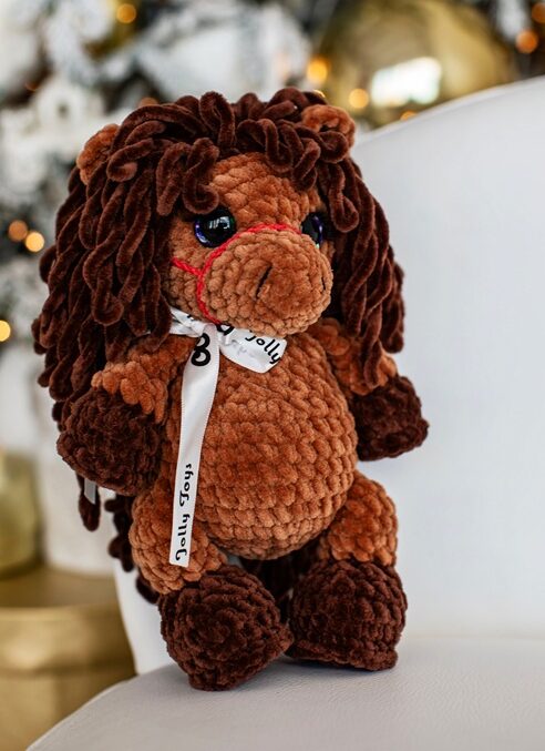 Kas otsite täiuslikku, pisut väiksemat ja isikupärast kaisusõpra oma lapsele? See käsitsi heegeldatud tumepruun hobune on loodud pakkuma pehmet ja turvalist kaisusoojust, olles samal ajal tähendusrikas mälestusese.